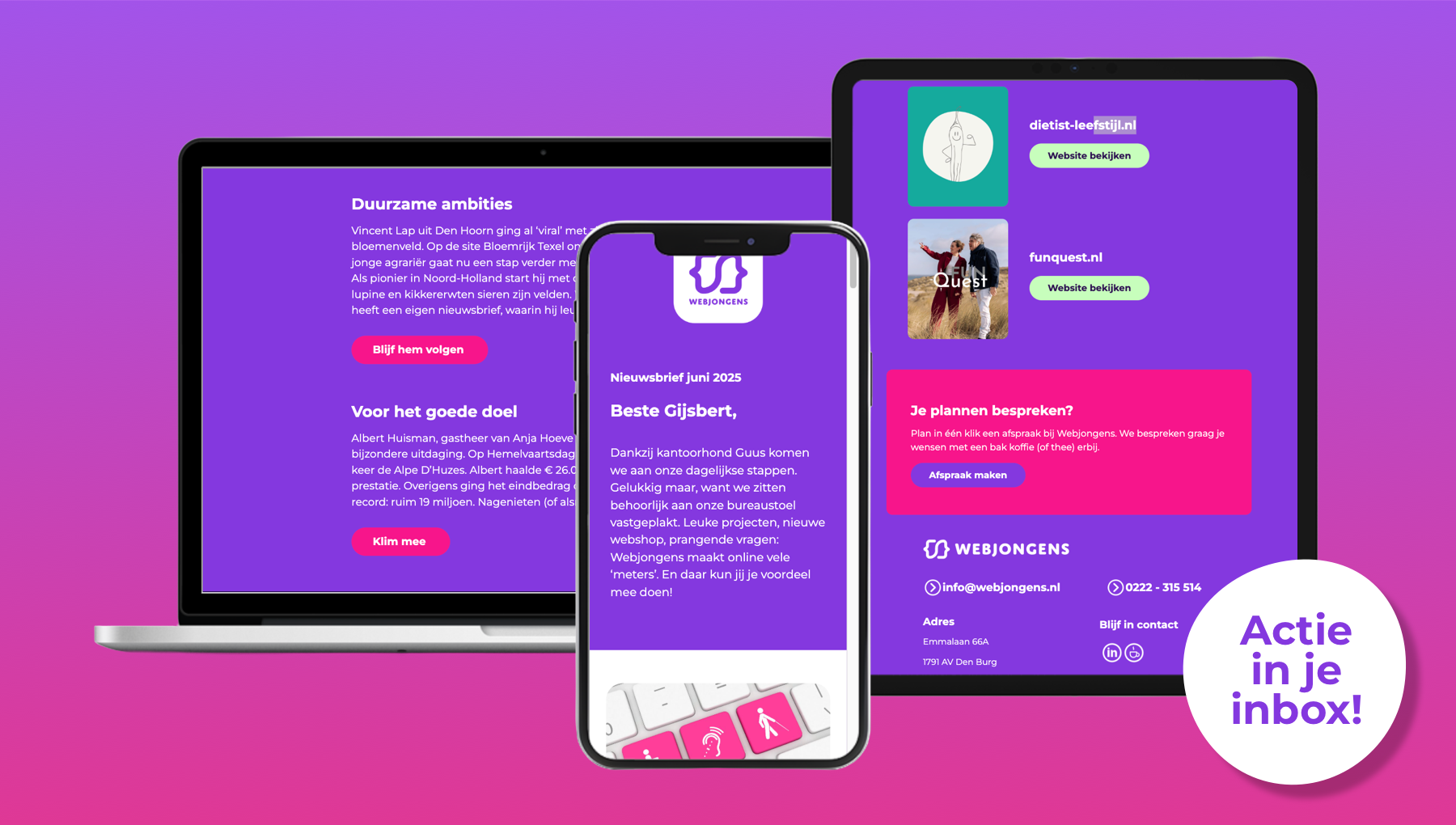 Na oplevering van je website verdwijnen we niet van het toneel. Wil je ondersteuning bij het versturen van een nieuwsbrief of op je site? Dat regelen we voor je. Technische updates houden we ook met alle liefde voor je bij. Je kunt ons altijd bellen voor advies.