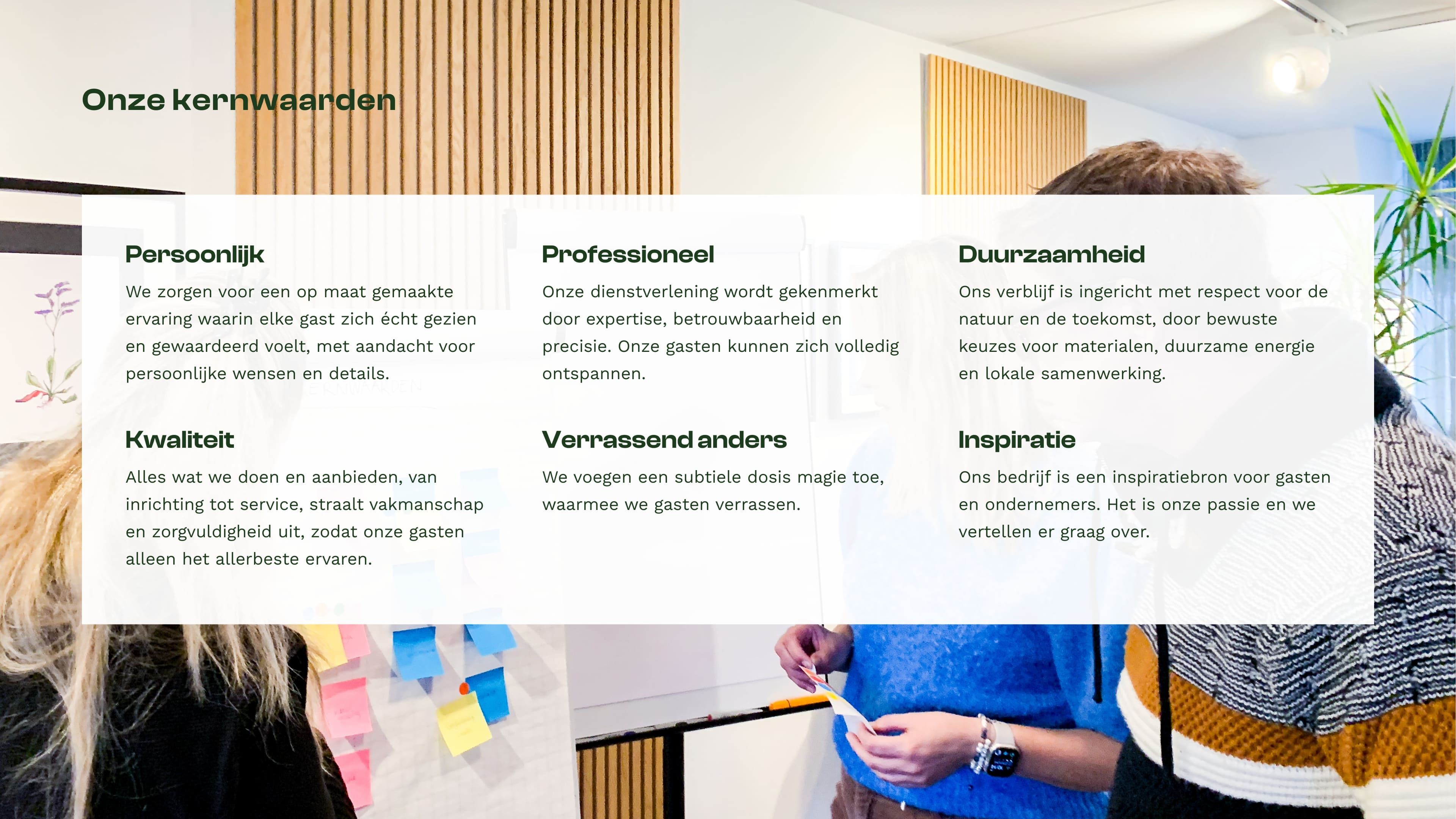 De uitkomst konden we vatten we in heldere visie: Nieuw Leven Texel biedt duurzame luxe op een plek die je hart verwarmt. Gasten genieten vandaag, met respect voor de wereld van morgen. Daarmee konden wij vol inspiratie aan de slag.