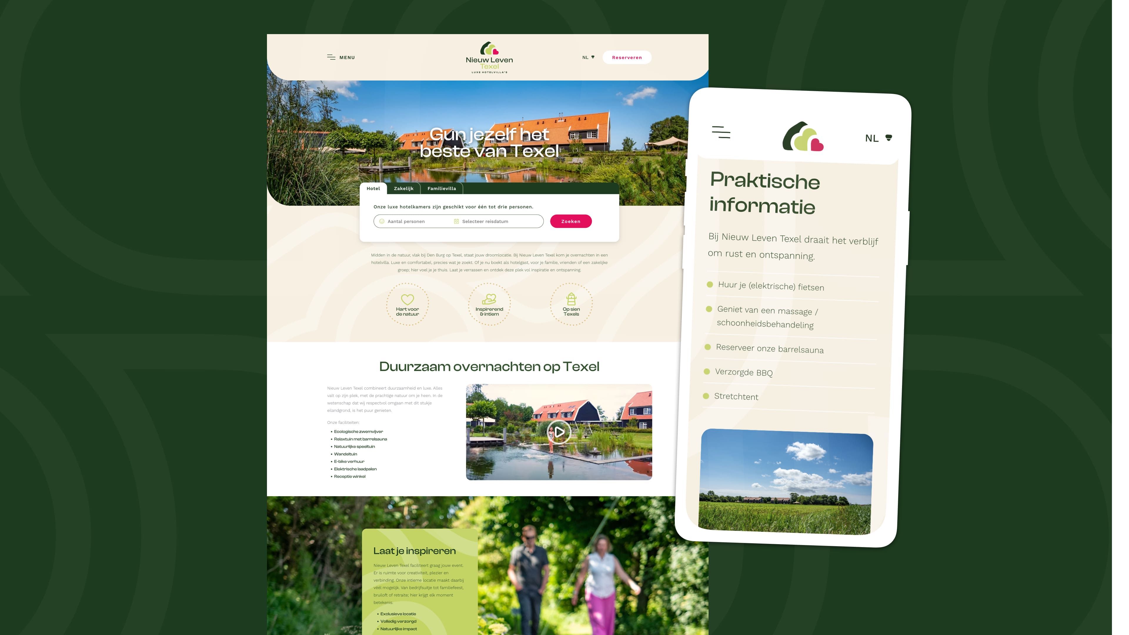 Nieuw Leven Texel doet het verrassend anders. Het concept combineert het beste van twee werelden: de service van een hotel en de luxe van een villa. Je boekt een losse kamer als hotelgast óf huurt een complete villa voor je (zakelijke) groep. Duurzaamheid zit hier in alles verweven. Van visie tot bedrijfsvoering. En dat vroeg om een sterk, doordacht merk.